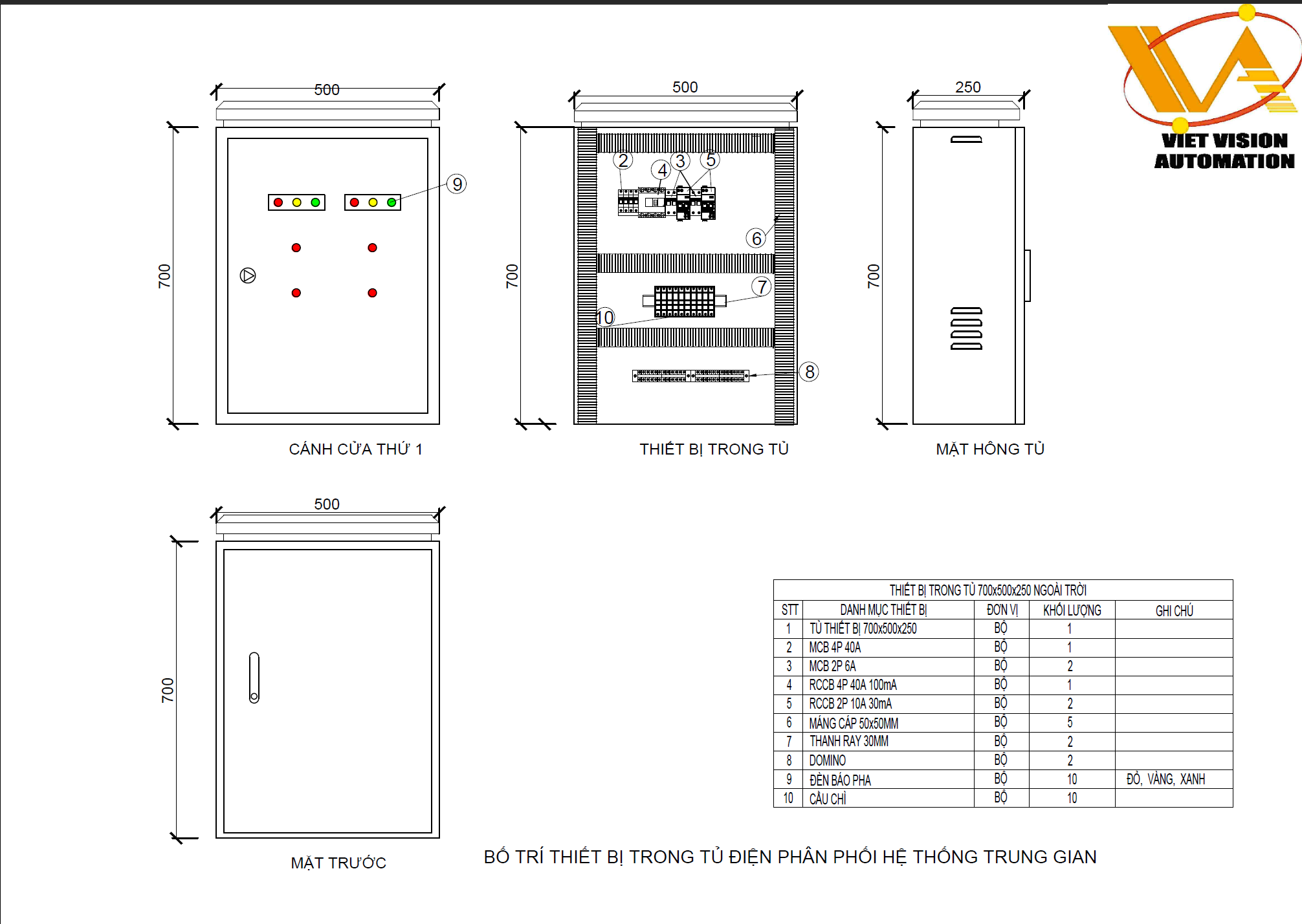 Vỏ tủ điện được chế tạo từ tôn dày 1.5mm có khóa bảo vệ, 1 lớp cánh, có mái che mưa, cách nhiệt bằng