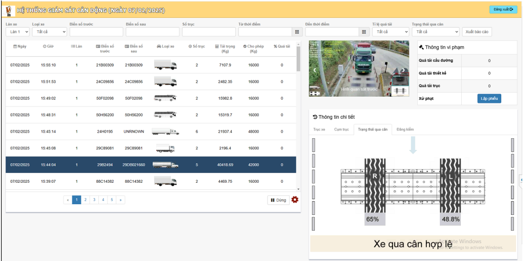 liệu biển số và hình ảnh xe lưu thông qua làncân với thông tin cân tải trọng