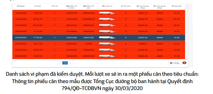 Tra cứu dữ liệu lịch sử cân xe theo theo mức độ vi phạm tải trọng •